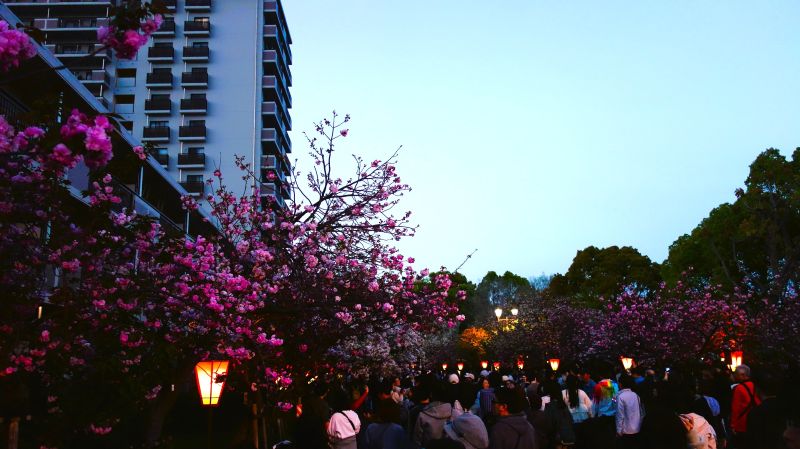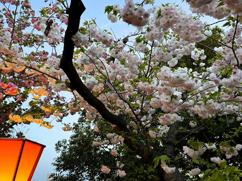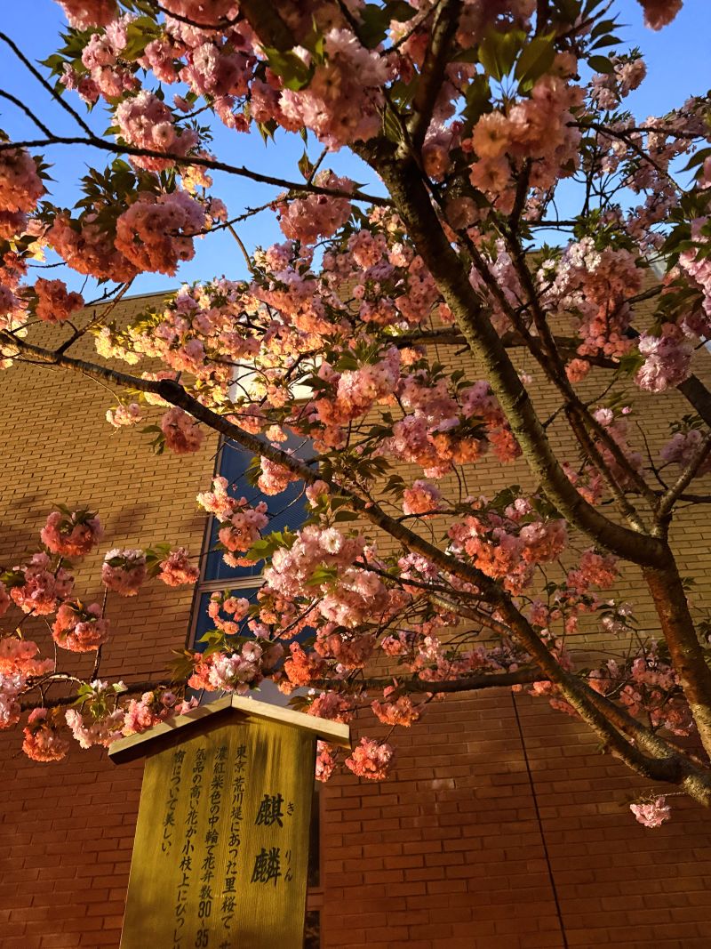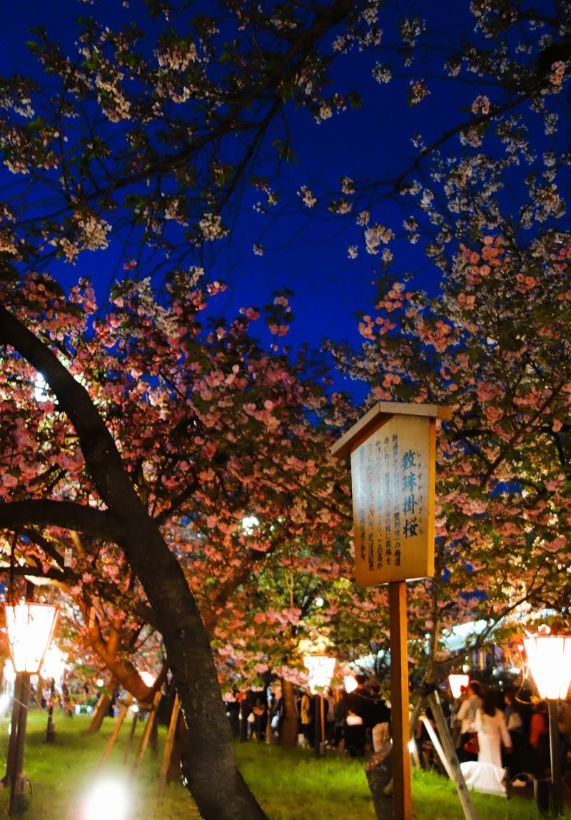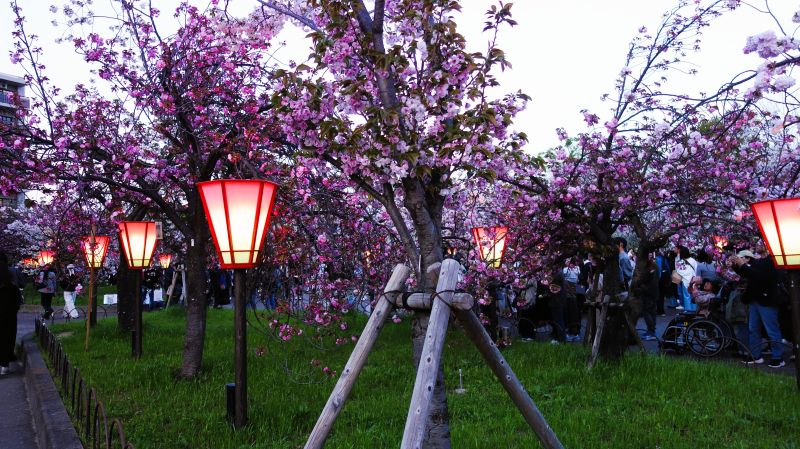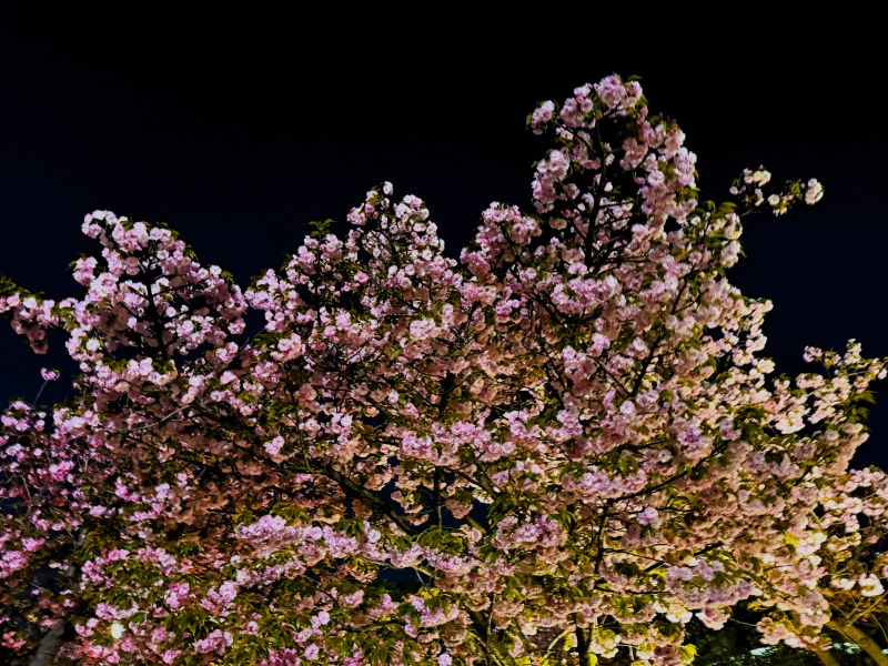 4月中旬〜下旬に濃いピンク色の華やかな八重咲きの花を咲かせる関山(カンザン)が多くって印象的だったが麒麟って言う品種も綺麗だった。サクラキリン(桜麒麟) 和名は、モクキリンの仲間で花色が桃色なので夜桜だと更に美しい色彩を放っていた。