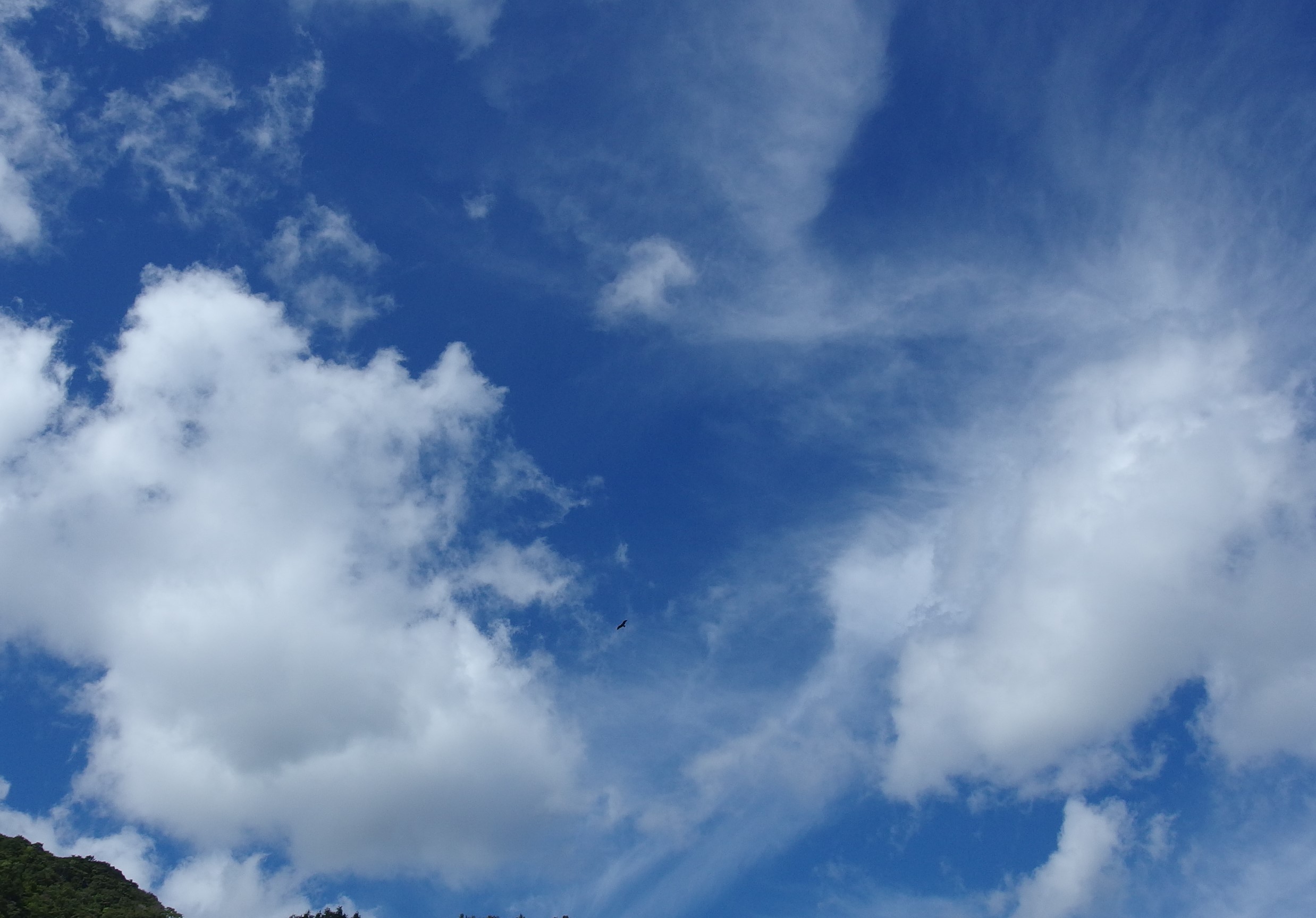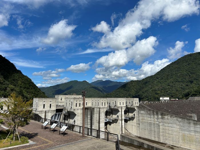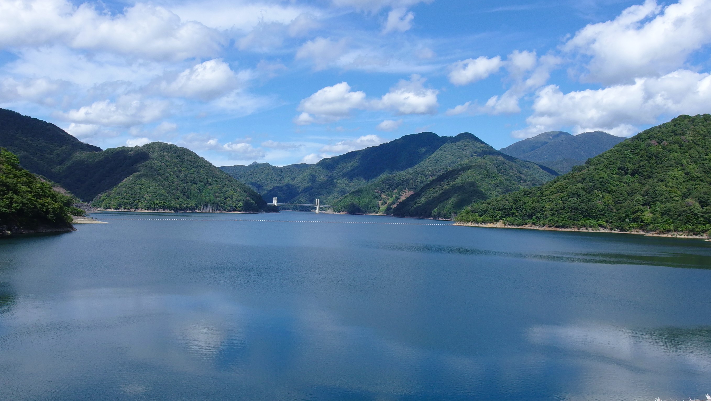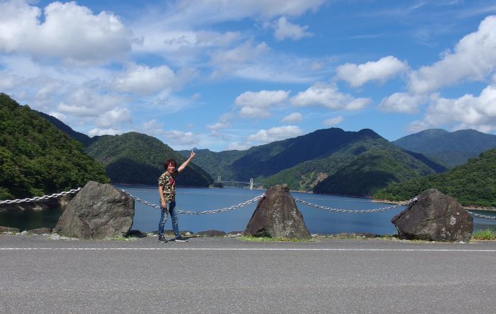 青い空、ダム湖が美しくって思わず笑顔で景色を眺めてた