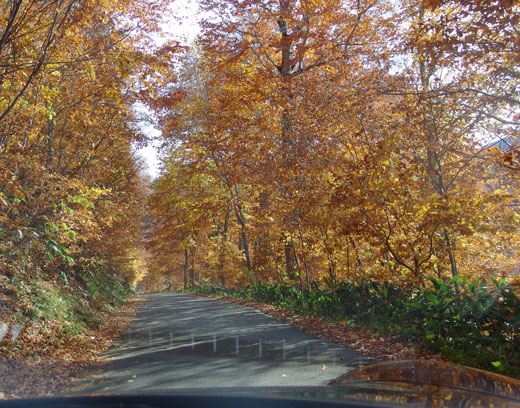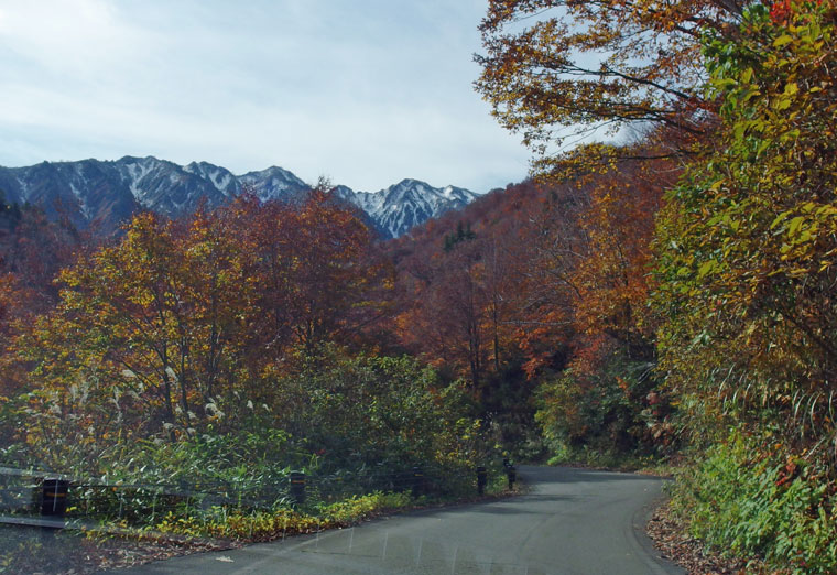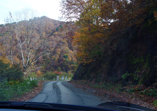 秋色に染まった山々、冠雪した山々を眺めてるとひたすら走って行ける。ドライブまにあをそんな気持ちにさせてくれる道景色だった。さすがは国道で路面状態は周囲の雰囲気ほど悪くなく終始、舗装路となっていた。時折、山間から湧き水が道を流れていたり、段差が激しい箇所があるので車高の低い車は用心した方がいい。走りやすさ、快走路、駆けぬける歓びと言うことなら八幡平樹海ラインが勝ると思う。が、この奥只見樹海ラインも素敵な道だ。
