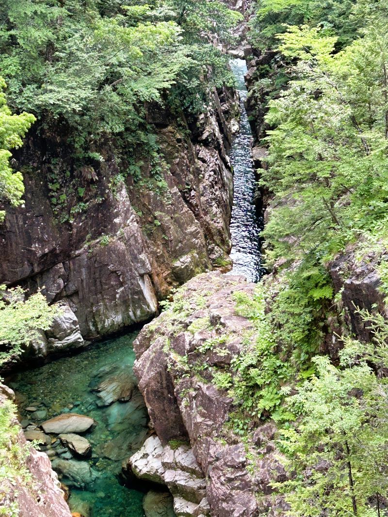 6月初旬であじさいのシーズンには早いし紅葉時期でもないせいかひっそりとした渓谷は静寂で綺麗な景色に流れる川の水の音が展望道にもはっきり伝わっていた。