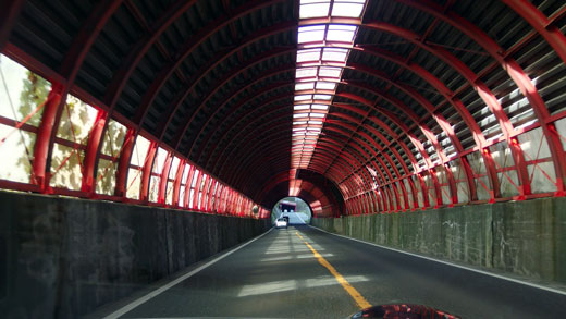 スノーシェッド、スノーシェルターなんてのが多い道で通り抜ける際に引っ張るとええ音が響きドライブもまた楽しぃ