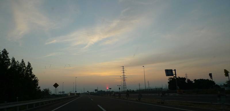 17日は早めに寝て早朝3時とか4時には家を出るつもりでいました。が子供が寝るような時間に寝てしまって予定より早く目が覚めたので道路状況、割引時間も考慮して予定を変更し出発は23時30分となりました。名神、北陸道と深夜帯と言うことと連休も最終日となるので帰路に向う方は多少居られたようで宝塚IC界隈等は多少混雑もあったようですが快適でした。なにはともかく例の休日高速料金1000円が廃止されて高速道路はようやく高速に戻ったのが大きいです。写真は北陸道を走って新潟に突入した辺りで日の出が・・・車内から見てて綺麗に感じて思わず写真を撮りました。出発から5時間30分を経過していました。
