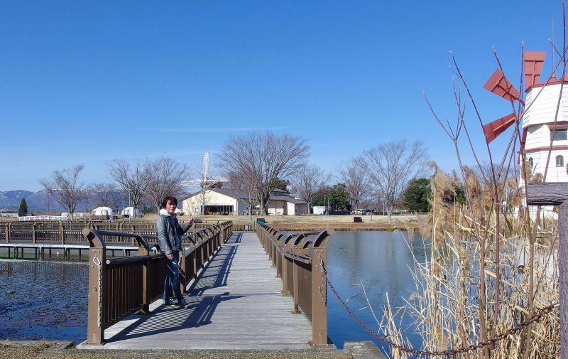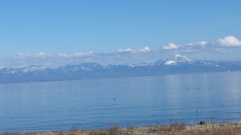 道の駅「しんあさひ風車村」に車を停めて対岸の湖東側の冠雪した山々を眺めながら湖岸を歩いたんだ。日課のウォーキングを兼ねてね