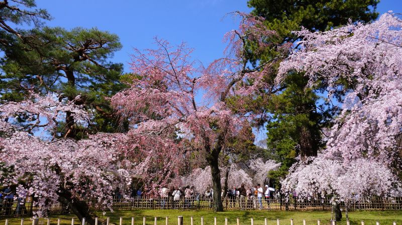 どこまでも広大な敷地と、歴史の重みを感じる建築。桜の「動」の美しさと、御所の「静」の美しさが共鳴する贅沢な時間。
