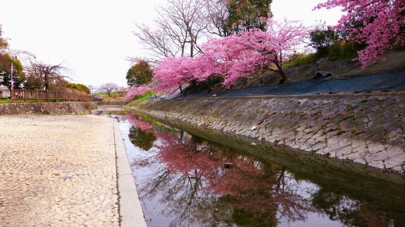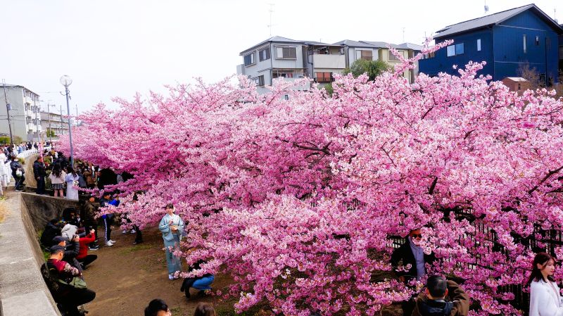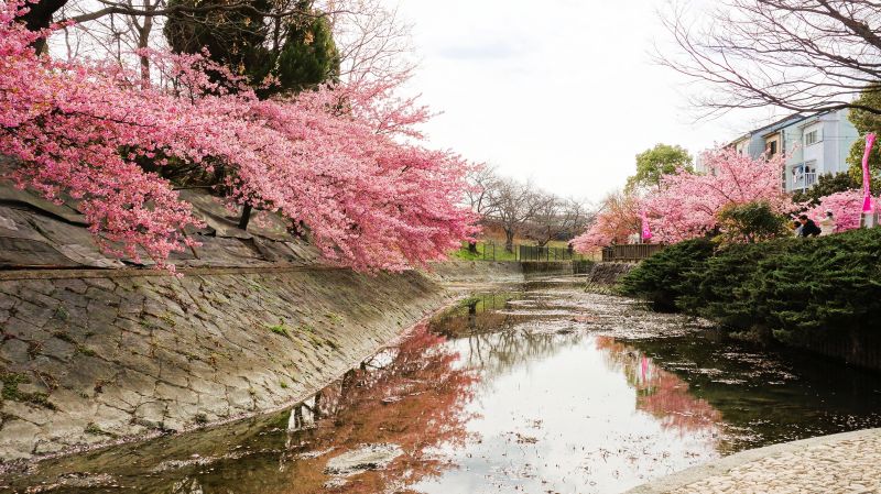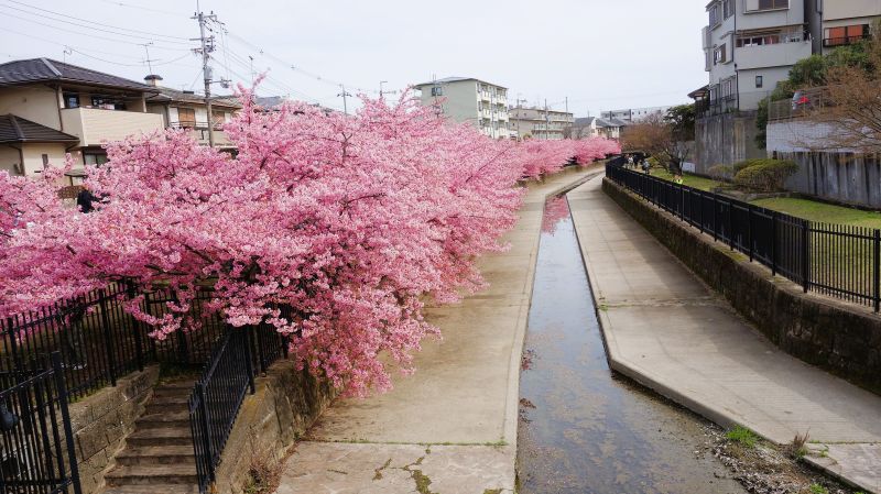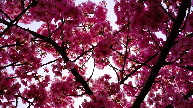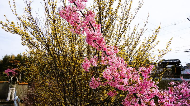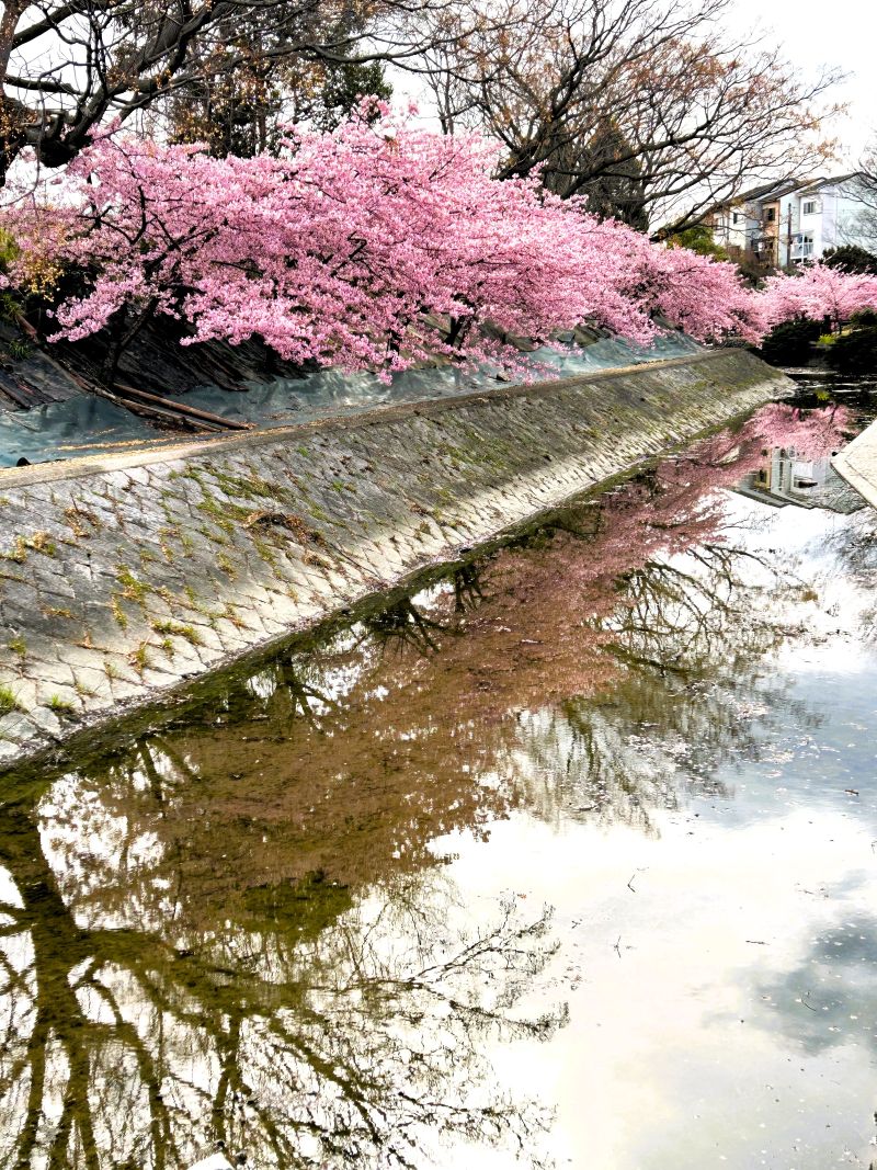 時折、晴れ間が射すものの暖かった2月とは違って例年より寒い3月のひと足早い花見は曇りがちなおかげで河津桜のピンク色がより一層にピンク色に見えて鮮やかでした。