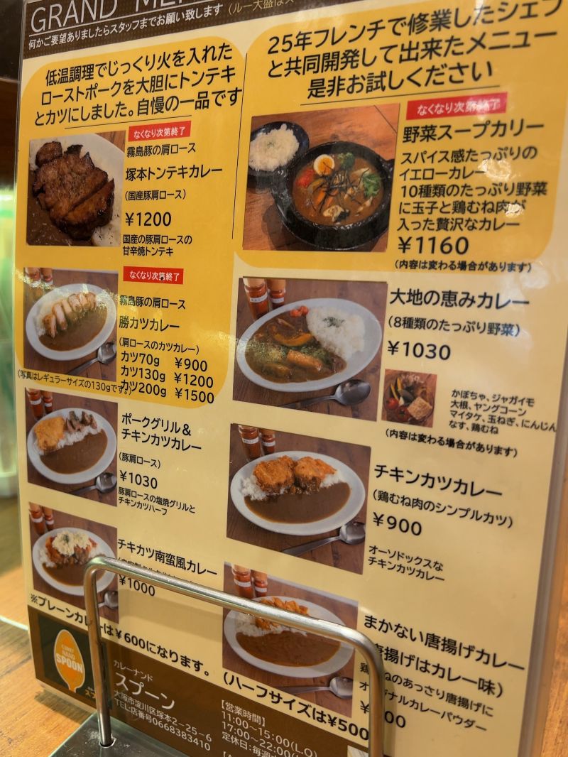 大地の恵みも野菜スープもお気に入りでトンテキをトッピングしたりすると腹いっぱいになってしまうので食べ過ぎを食べ終わった後で後悔してる。なので、今日は値上がりもしてたのでスタンダードな塚本トンテキカレーにしたんだ