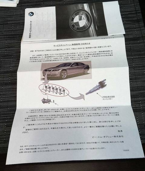白い封書に赤いフォントで何やらベタな感じだけど無償修理の文字にあら?リコール??とは思ったけどリコールとまでは行かないようだ。インジェクター(燃料噴射装置)の不具合で製造機械のオイルが混入している恐れがあるとのこと。要は部品不良が発覚したのだなと思ったけど幸い愛車の335クーペはCDチェンジャーくらいしか所有者が故障を認知してないので目くじらを立てることもなく(笑)ま、あるわなくらいにしか思わなかったわけで(爆!)自動車って恐ろしいくらい部品点数多いからそれなりに部品故障って付き物ですから。とは言え自分の車が調子いいから余裕あるのかも知れないけどね(^^)
