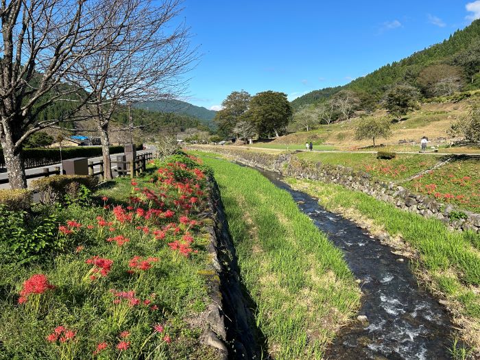遺跡に向かいながら歩いていると彼岸花、小川のせせらぎに癒されました。