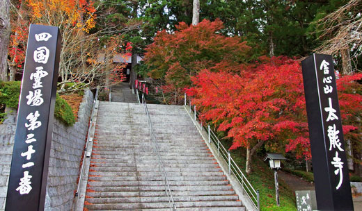 「西の高野」とも称される太龍寺は四国山脈の東南端、標高618メートルの太龍寺山の山頂近くにある。樹齢数百年余の老杉の並木が天空にそびえ、境内には古刹の霊気が漂う荘厳なスポットで宗旨が真言宗なら一度は訪れたいところだ。