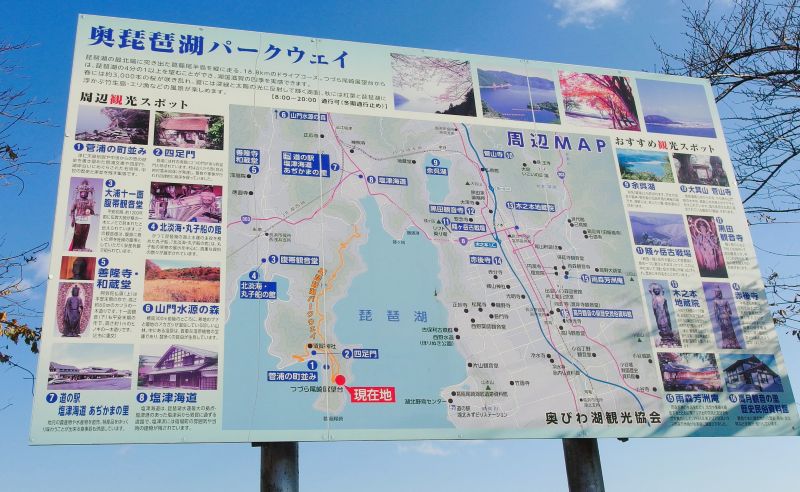 現在、奥琵琶湖パークウェイは冬季閉鎖期間に入っておりますのでルートがおかしく表示されていることはご了承ください。