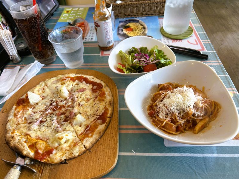 生パスタのソースはトマトソースをチョイスしてしまう。(好きなので...)パリッと焼き上げたピザはじゃがバタマヨネーズをいつも選ぶ(こちらも大好きなので...